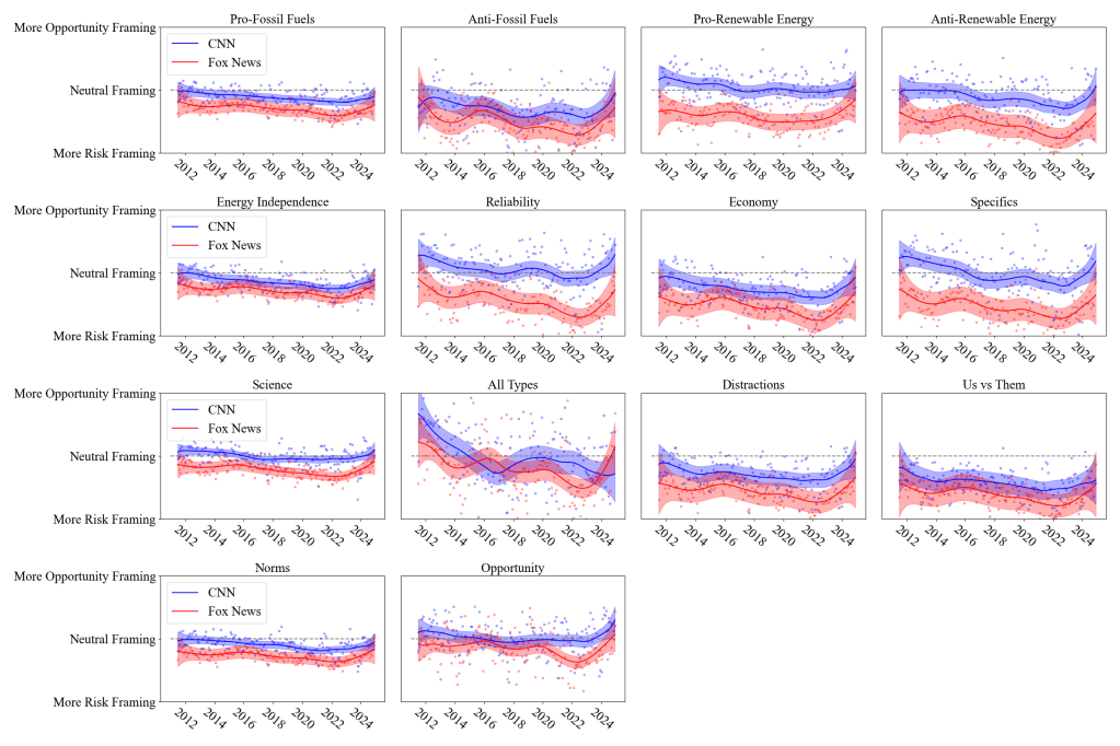 Transitioning to renewable energy resources is crucial to meet energy consumption demands while mitigating the effects of fossil fuel reliance. Large scale renewable energy (RE) projects, such as wind and solar farms, can support growing energy demand while requiring little change in household behavior. Recent research has documented how local opposition has led to the delay and cancellation of many RE projects, but the sources of this opposition are not well understood. Concurrently, there is variation in the ways that news broadcast networks discuss RE projects, providing selective information to viewers that may sow the seeds for both local opposition and support. Considering that individuals use news media as a central resource for information, this study asks: how does news coverage of sustainable energy topics influence individual perceptions towards large-scale RE projects? Through the analysis of a nationally representative survey of 4,000 US adults paired with transcripts of nearly 250,000 news broadcasts from Fox News and CNN, we find the choice of network explains variance in support for RE projects, potentially stemming from the framing of these projects through different rhetorics across the sources. We use a qualitatively informed deep learning topic model, finding that while both networks highlight the economy and energy (in)dependence from foreign sources, Fox News pairs this with strong pro-fossil fuel and anti-RE rhetoric, framing the transition to RE as “risky.” This framing aligns with results from a structural equation model that reveals a pattern of strong opposition to RE projects across Fox News viewers in the national survey. Planning successful RE projects depends on surfacing drivers of support and opposition, and this analysis reveals communication strategies which highlight the opportunity for green jobs and energy independence from foreign sources provided by large-scale domestic RE projects have the potential to increase support.