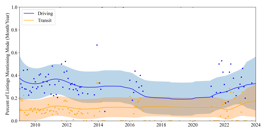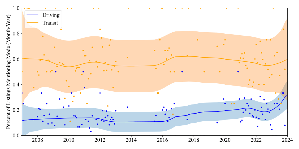 In North America, the widespread reliance on personal vehicles for mobility presents a significant challenge for climate change mitigation. Despite commitments to improve sustainable transportation networks, only 12% of US cities saw a decrease in personal vehicle dependence over the last 15 years. Changing individual behaviors around mode choice is notoriously difficult, but the behavioral science literature has identified an opportunity for intervention when people change home locations, therefore changing their routines. Little is known, however, about what signals people receive about the mobility culture of their new home location that may influence their inclination for change. Therefore, this paper asks: how does normative language around mode choice reflect shared perceptions of the mobility culture in a city? Drawing on two decades of archived online rental listings from two US cities with recent transit expansion projects but different mobility cultures, Boston and Phoenix, this study first extracts and analyzes language around transportation options through fine-tuned supervised BERT-based topic models and then uses a difference-in-differences approach to test the causal effect of transit network expansions on the frequency of transit mentions in listings. We find that Boston listings mention transit options more often than Phoenix, even when accounting for proximity to major transit stations. Additionally, we find a positive causal relationship in both cities between expanding the transit network and increased mentions of transit options in the immediate vicinity of the change, but not for the network as a whole. This suggests that normative signals about travel mode reinforce the dominant mobility behaviors irrespective of transit availability, however changes to the transport infrastructure can disrupt these norms. We argue that rental listings tell a story of a city’s mobility culture that is being presented to homeseekers at a critical transition time–when they are potentially most receptive to changing their travel behavior.
